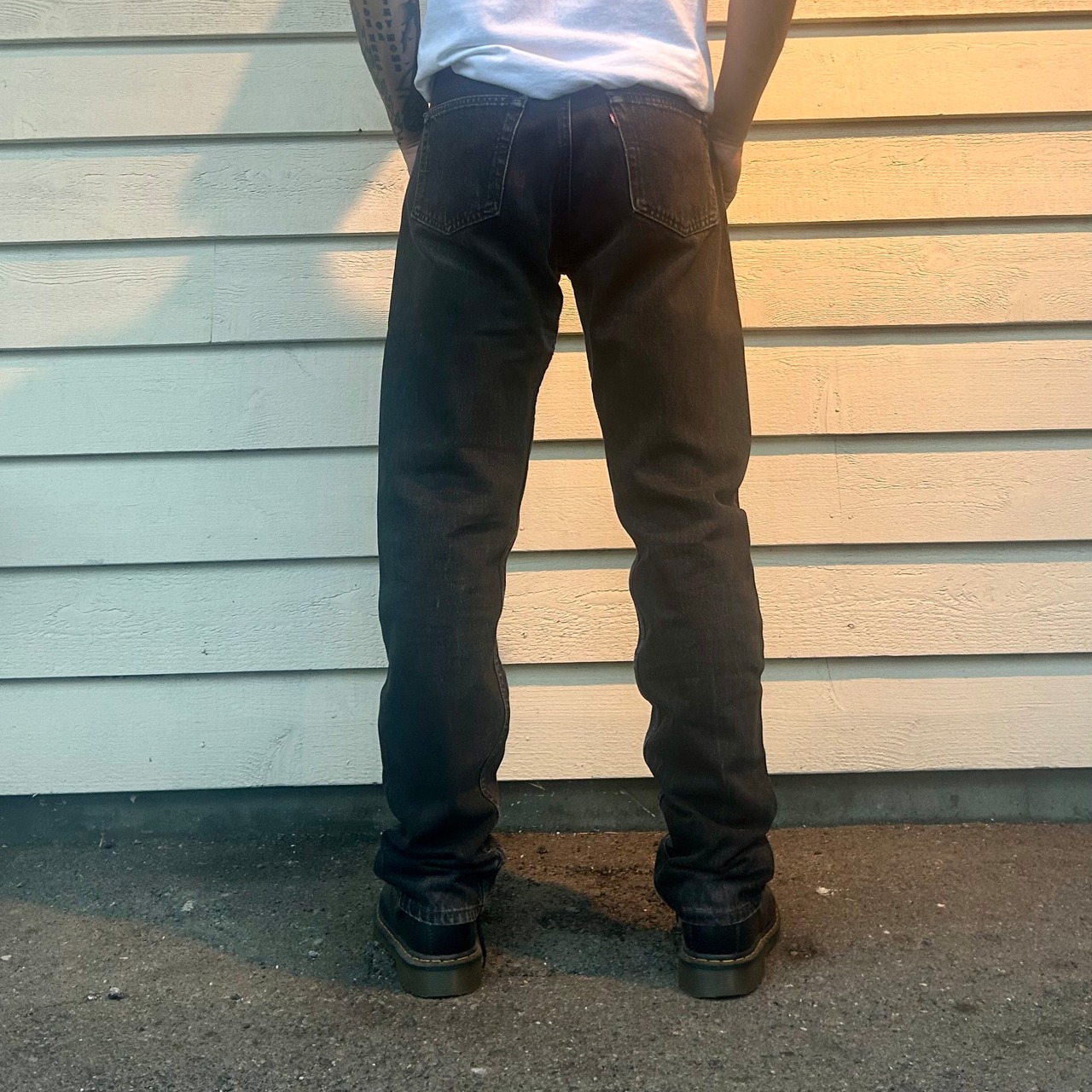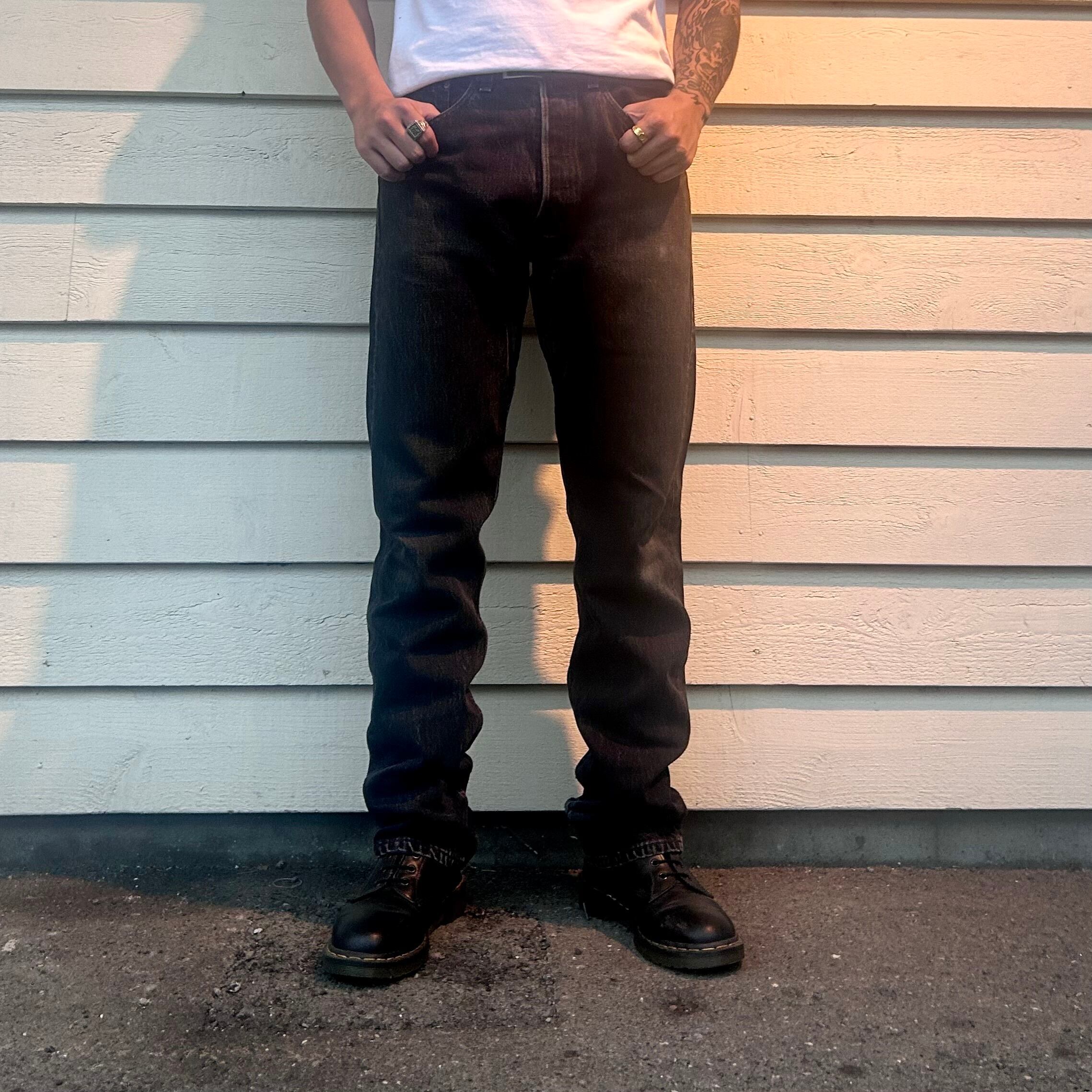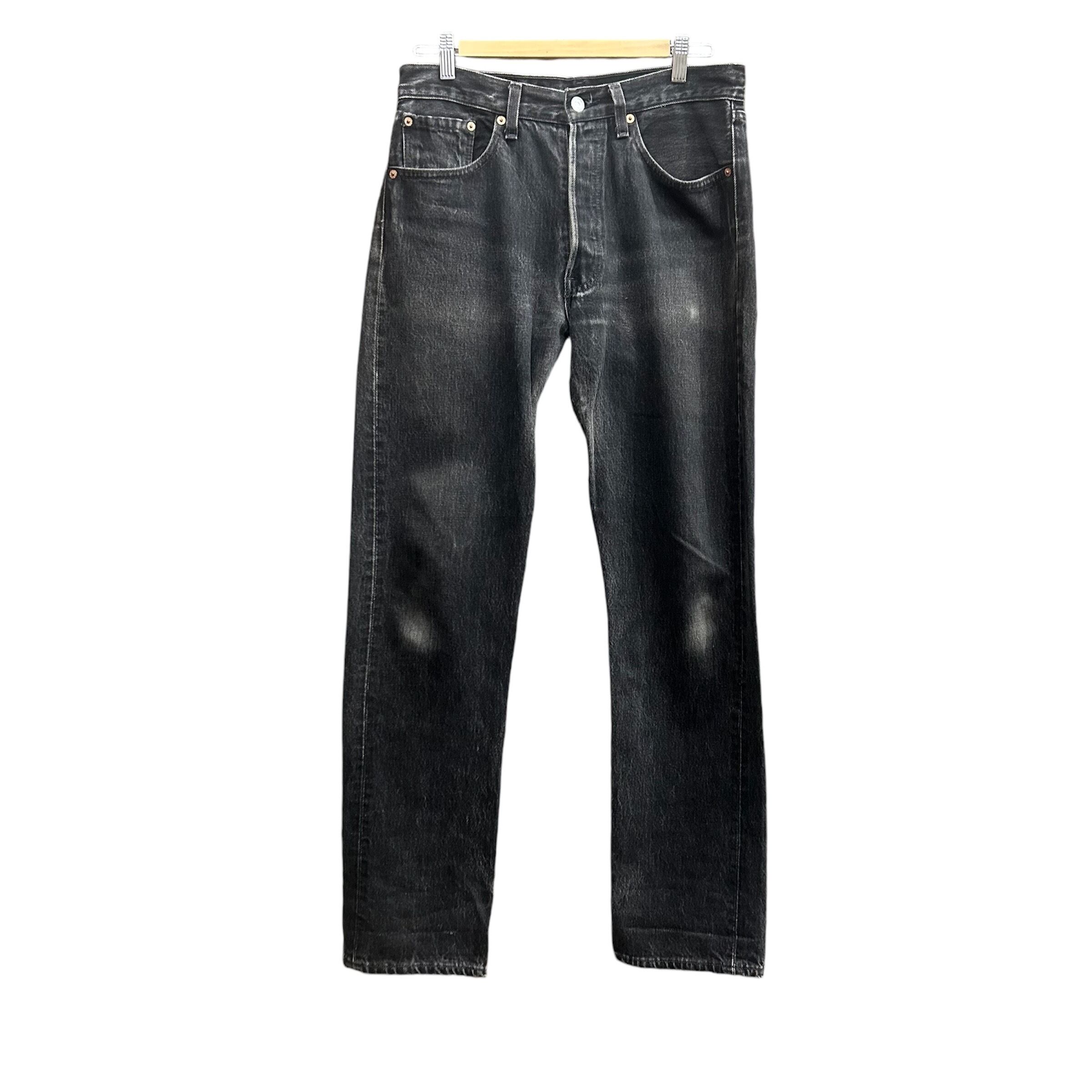 501の定番のストレートカットはカジュアルからフォーマルまで様々なスタイルに合わせやすく長年愛されている商品です。90年代のデザイン、ディテールはヴィンテージファッションのアクセントとして非常に魅力的であり、ブラックデニムはシックな印象を与える逸品となっております。